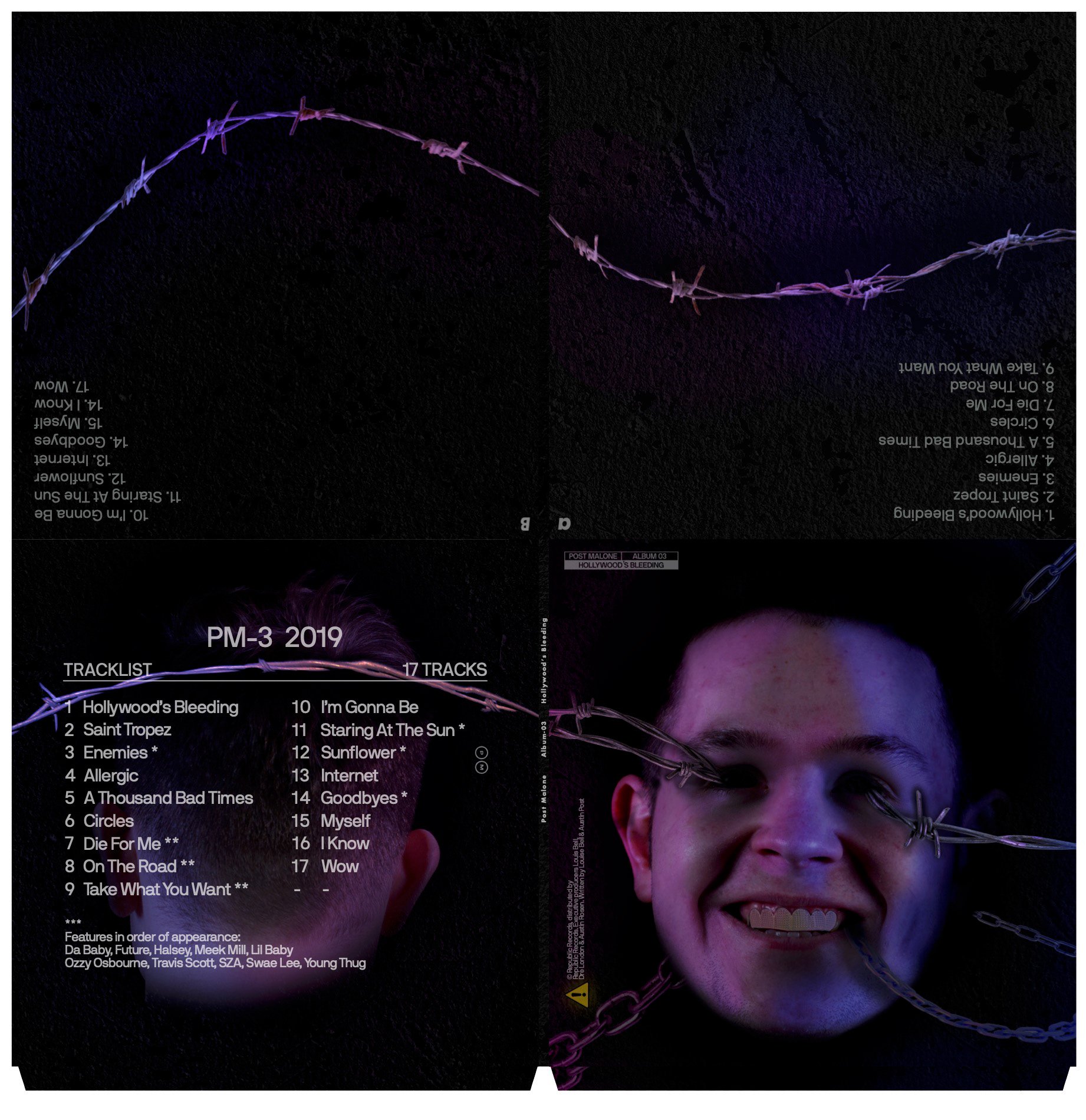 Oppgåva var å lage eit LP sleeve til eit valfritt album. Her lagde eg til Hollywoods's Bleeding, Post Malone's tredje studio album. Om man bretter saman sleeven vil man oppdage at piggtråen går uavbrutt gjennom og rundt heile LP sleeven.